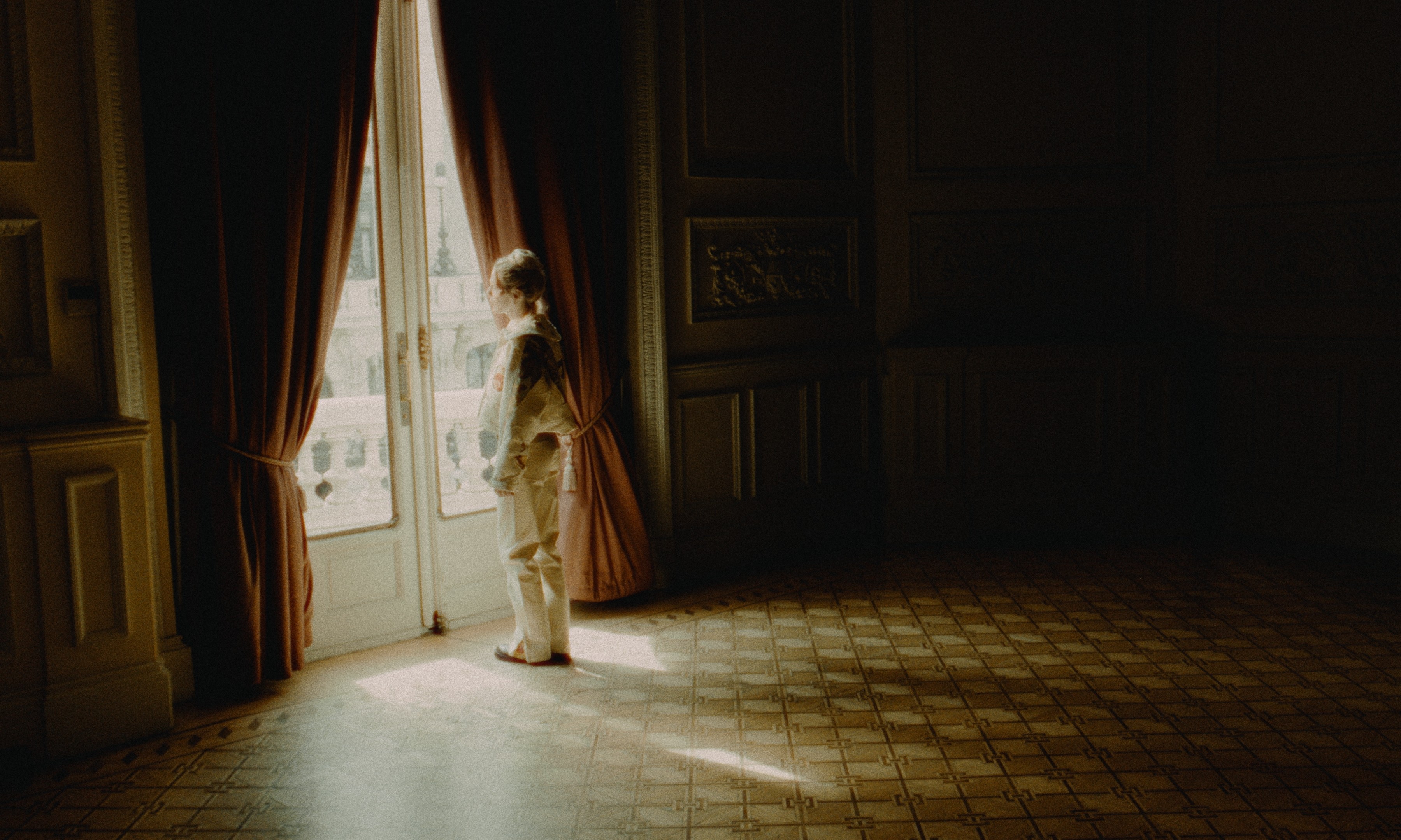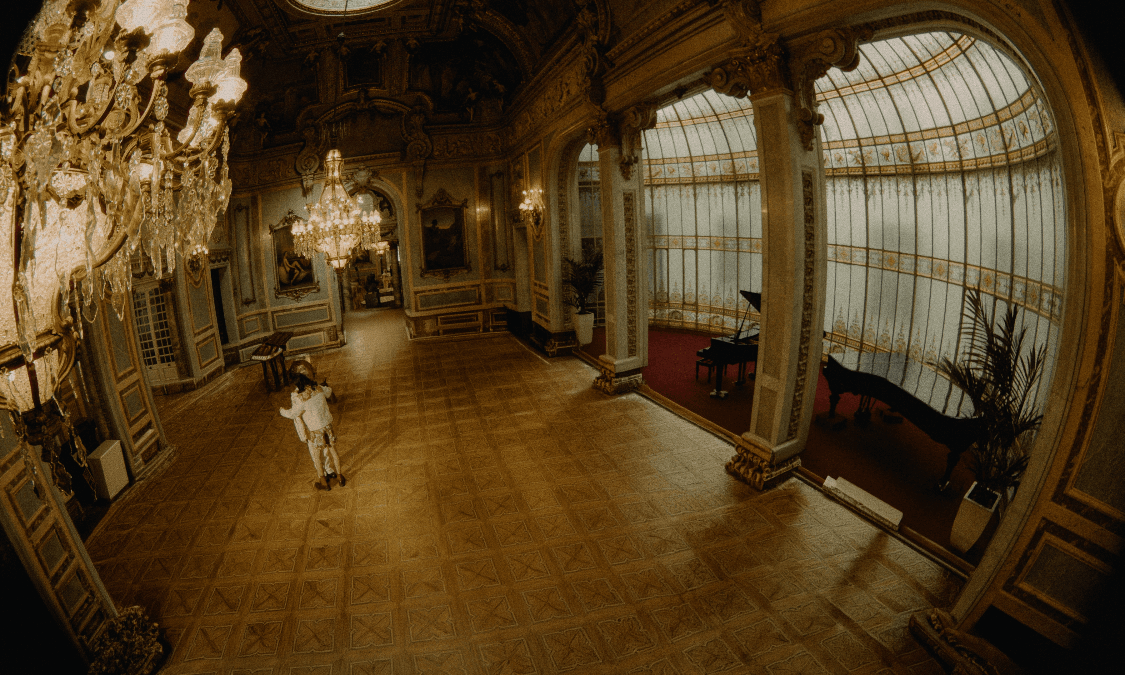 The piece is set in the historic Gran Casino de Madrid, whose opulent architecture—blending marble finishes, floral ornamentation, and Corinthian columns—mirrors the interplay of contrast present in the collection itself. The space becomes a visual extension of the garments, where classic grandeur and delicate detailing coexist, echoing the film’s central theme of opposing forces in balance.